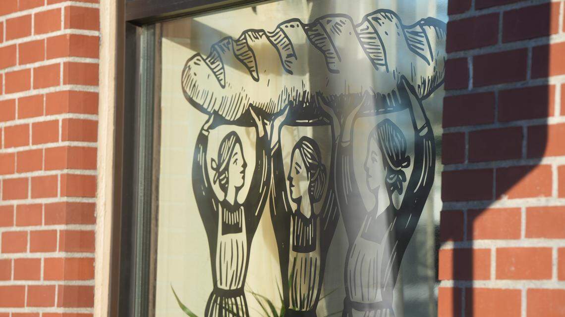 A Millet Bakery window decal depicts sisters Clara, Aemilia and Chloe, who own and operate the new bakery in Bellingham. Rachel Showalter The Bellingham Herald